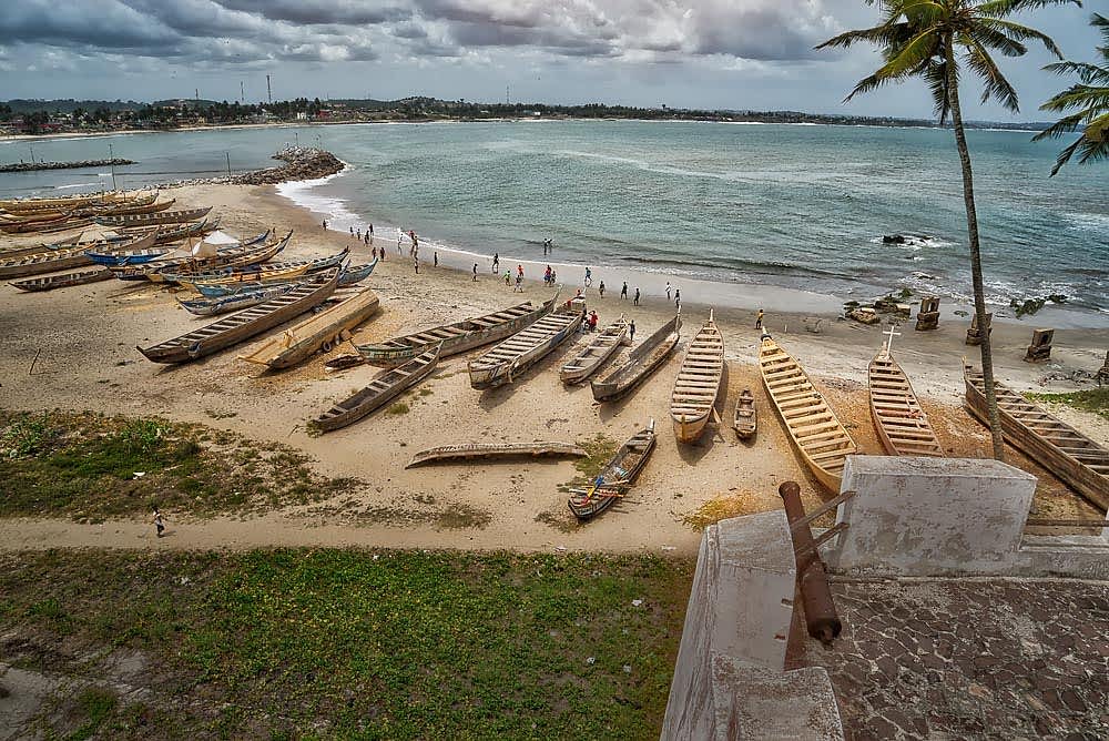 Some little baby boats nestled in there next to the bigger boats. What do you suppose those are for? On this hot afternoon there was hardly anyone out on the streets. Once I got up on the walls of Elmina Castle and could see the beach, there were even more boats pulled up there...including more baby boats. Or maybe they're not baby boats they're normal size and the other ones are just giant? From this perspective up on the castle walls those longboats look much larger.
